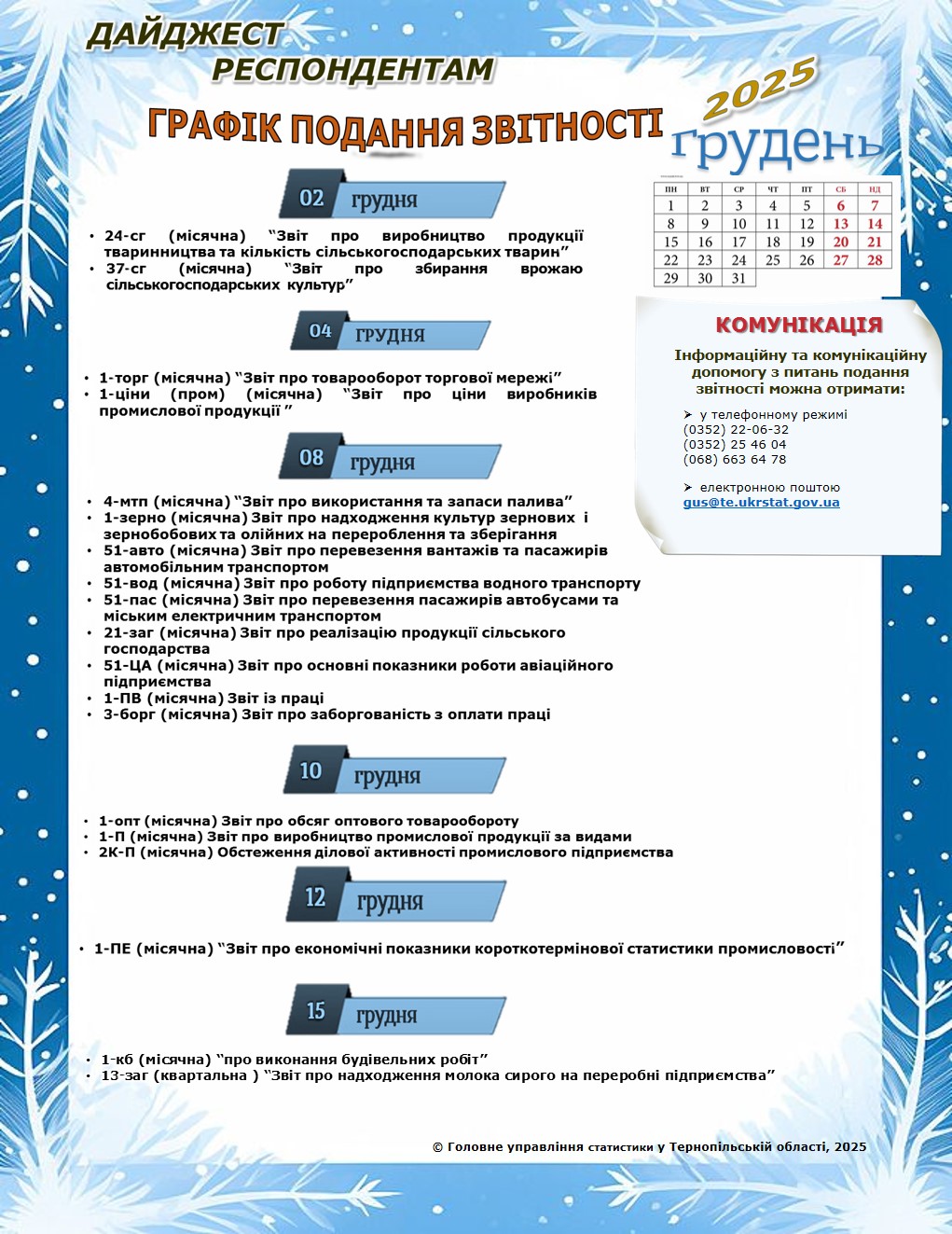 Графік подання звітності для респондентів у грудні 2025 року 04.12.202504.12.2025 Новини статистики statnewsНовини